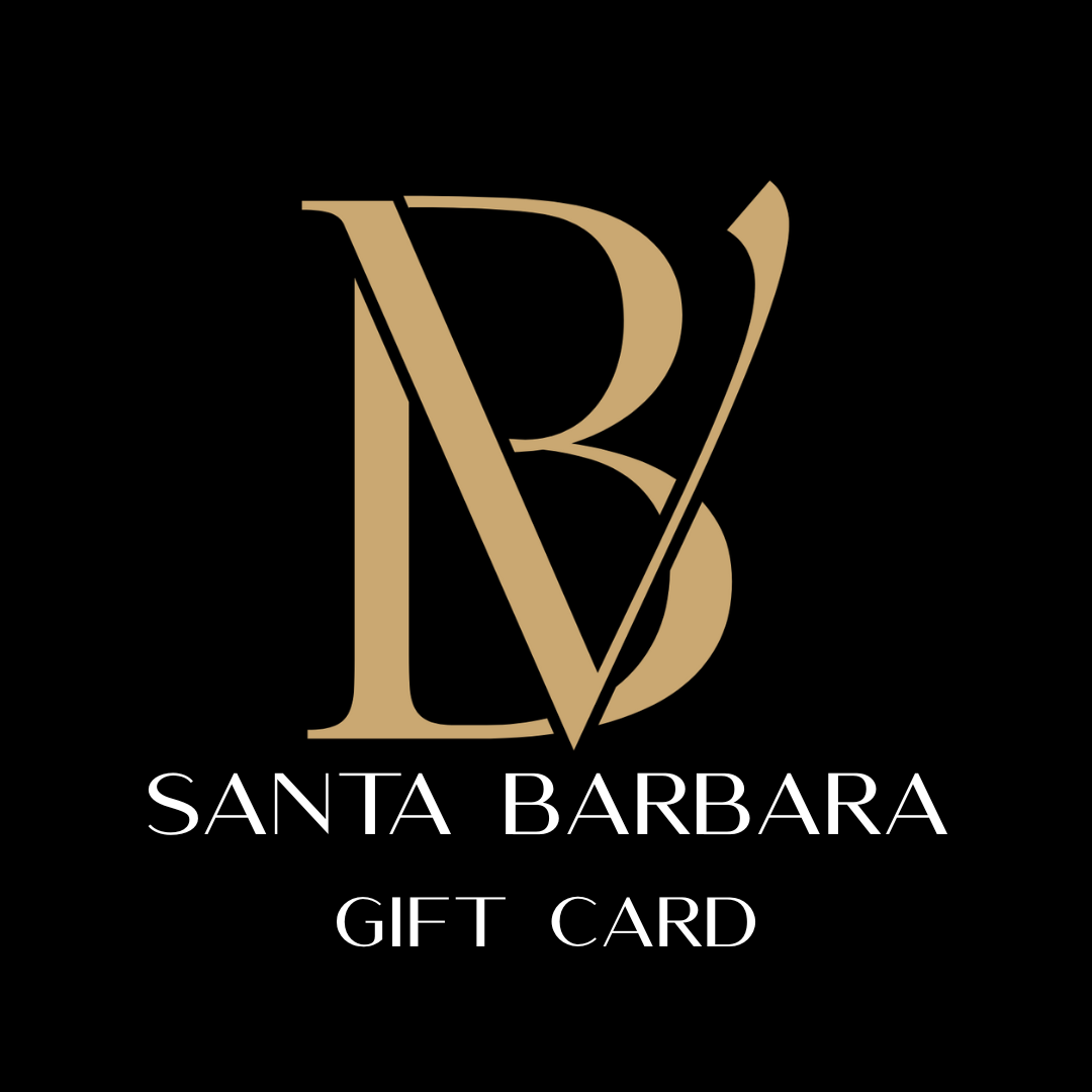 Three black Bella Vida Santa Barbara luxury skincare bottles with gold caps on a round glass table. Sunlight Serum, Cocomero Watermelon Glow Serum and Brighten Vitamin C Cream