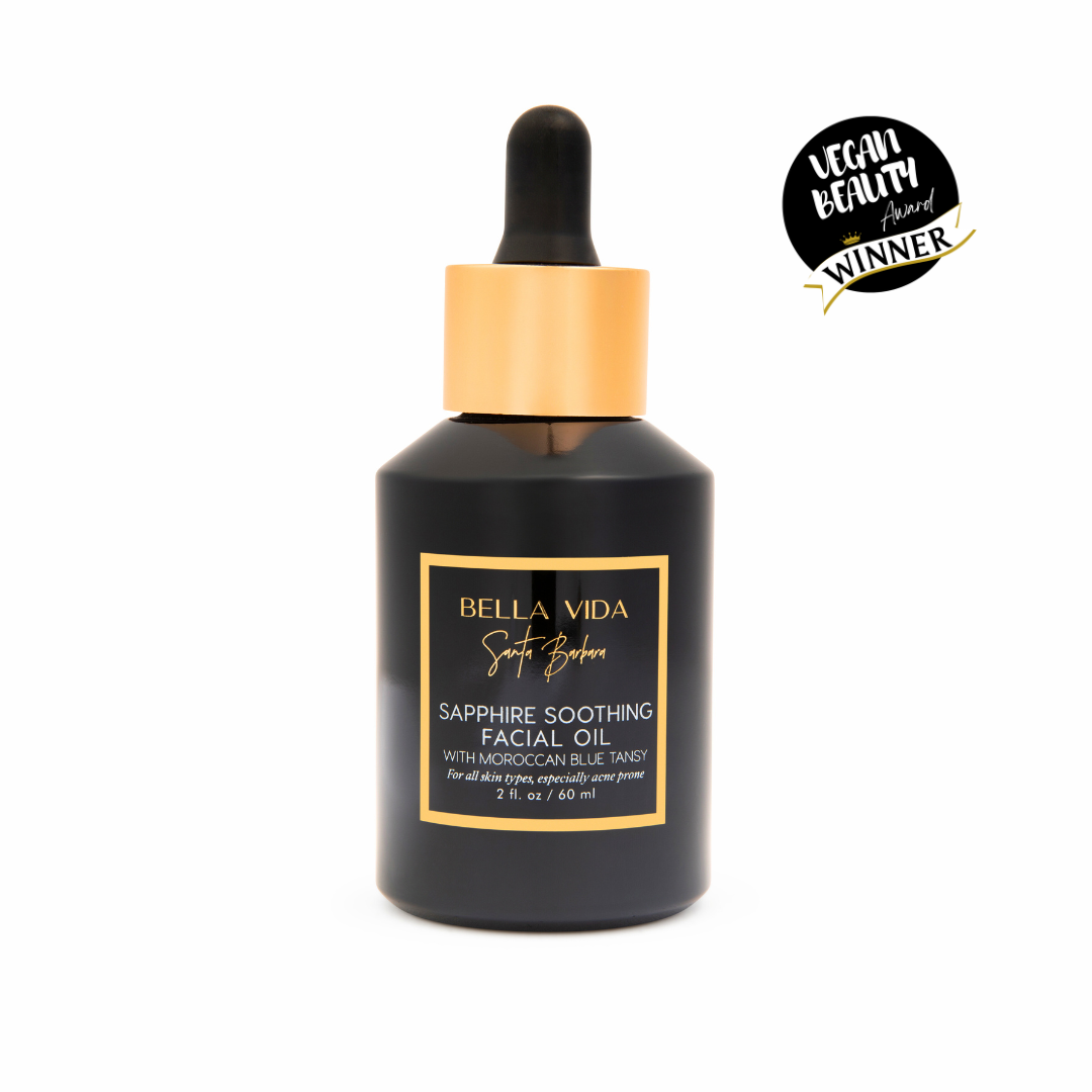 Three black Bella Vida Santa Barbara luxury skincare bottles with gold caps on a round glass table. Sunlight Serum, Cocomero Watermelon Glow Serum and Brighten Vitamin C Cream