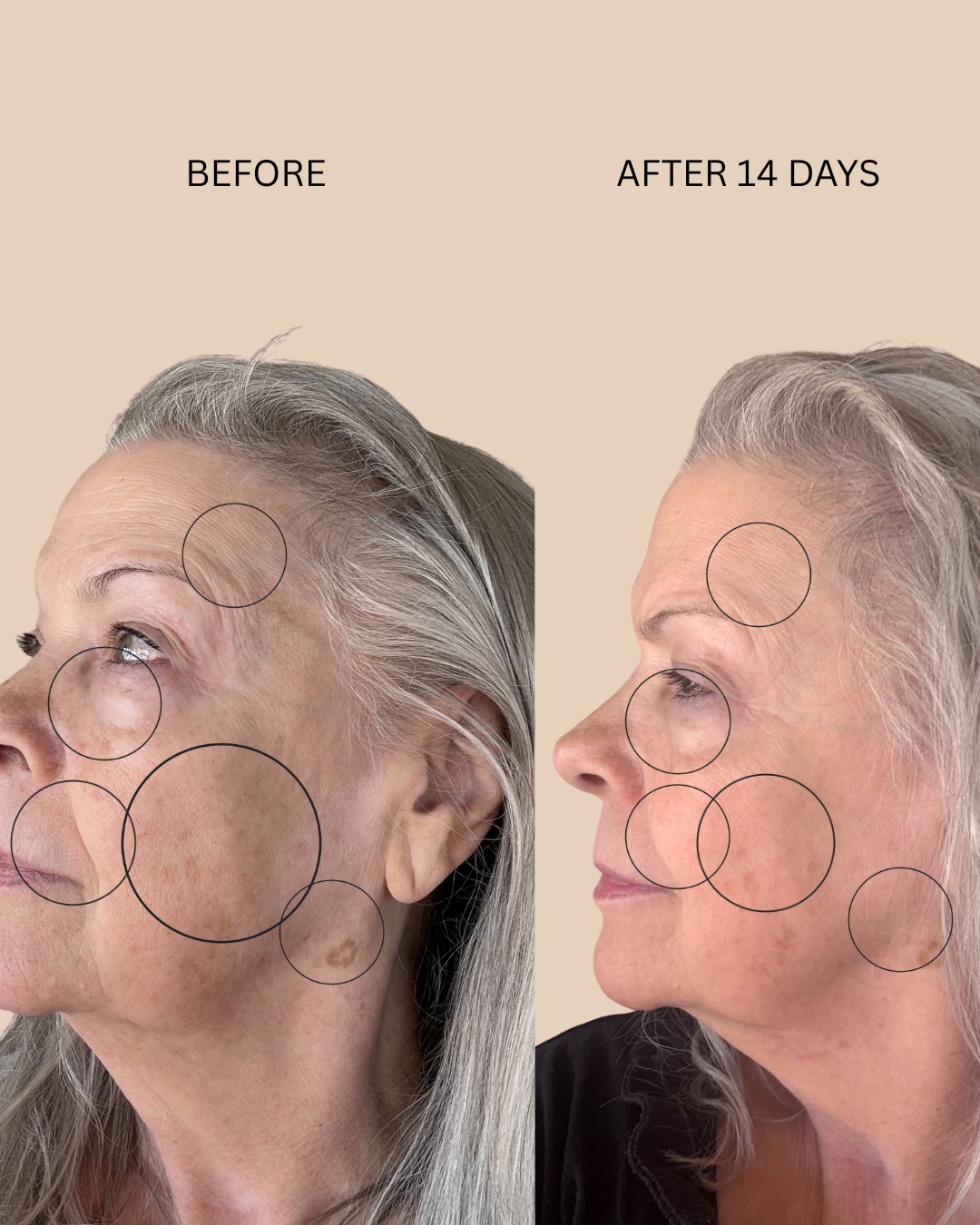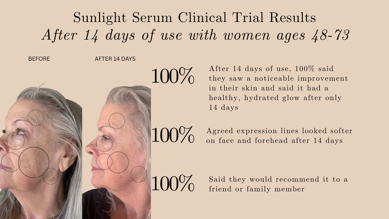 AFTER ONLY 14 DAYS OF REGULAR USE, 100% OF WOMEN AGES 48-73 IN OUR CLINICAL TRIAL AGREED THEY SAW A NOTICEABLE GLOW AND SKIN APPEARED HEALTHIER AND WRINKLES WERE LESS NOTICEABLE.